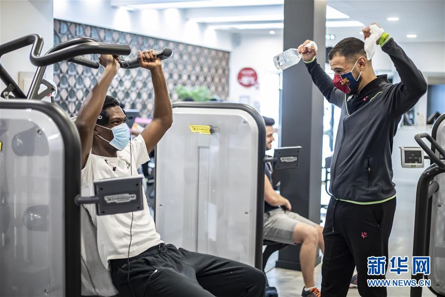 6月15日,在法国北部城市里尔,人们戴着口罩在健身房健身。 新华社发(塞巴斯蒂安·库尔吉摄)
