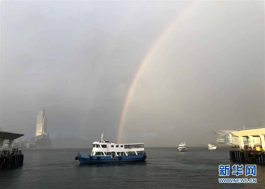 香港维多利亚港上空出现彩虹(6月16日摄)。 6月16日傍晚,雨后的香港维多利亚港上空出现彩虹,美丽景色吸引市民驻足拍照。 新华社记者 李钢 摄