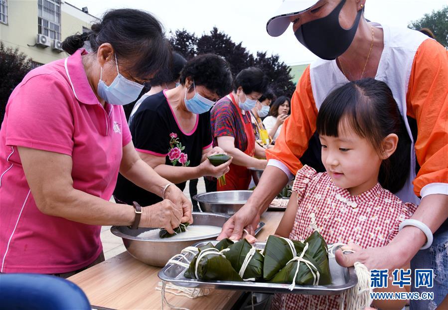 6月17日,水清沟街道居民在社区广场上包粽子。 当日,青岛市北区水清沟街道开展迎端午邻里爱心传递进网格活动,居民通过包粽子、吃粽子、网上端午传统文化课等形式传递邻里爱心,传承民俗文化。 新华社记者 李紫恒 摄