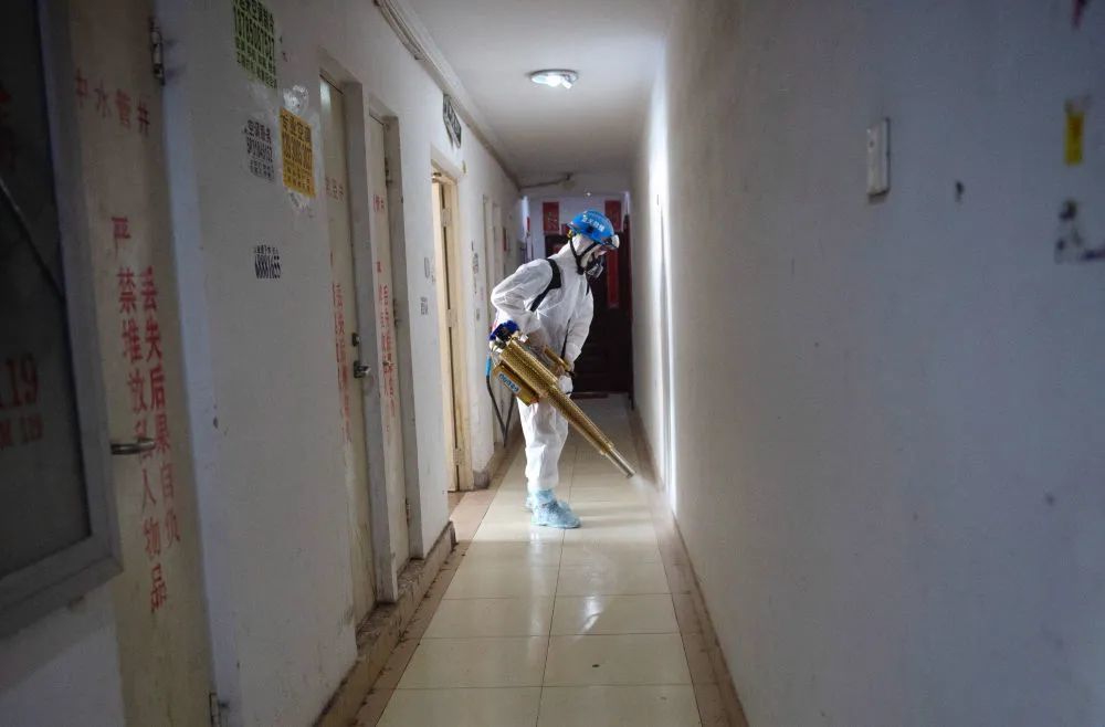 6月16日,北京蓝天救援队队员在丰台区一居民区楼内进行消杀作业。