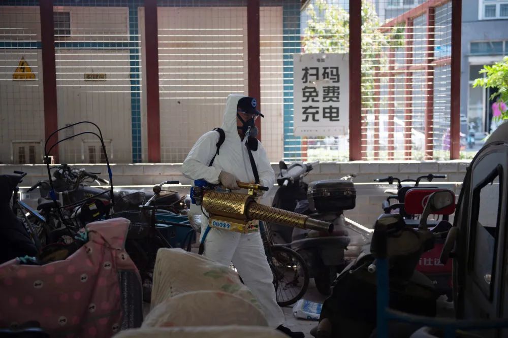 6月16日,北京蓝天救援队队员在丰台区一居民区车棚内进行消杀作业。