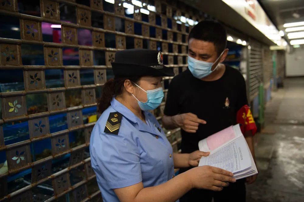 6月16日,丰台区市场监督管理局工作人员在岳各庄批发市场检查食品及相关产品进货台账。当日,记者走访位于北京市丰台区的农贸市场、餐饮企业、居民小区等场所,有关部门、社会团体等正有序开展消杀、检疫工作。