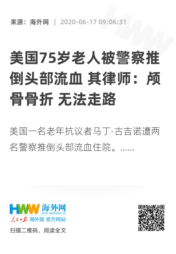 海外网6月17日电 美国一名75岁的老年抗议者马丁·古吉诺遭两名警察推倒头部流血住院,古吉诺的律师16日发表声明说,古吉诺的颅骨骨折,无法行走。