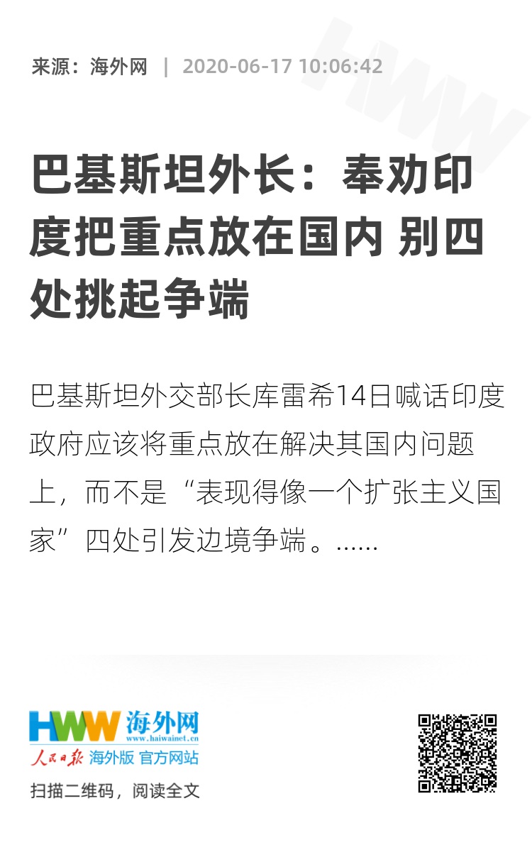 海外网6月17日电 近日,巴基斯坦外交部长库雷希(Shah Mahmood Qureshi)喊话印度政府应该将重点放在解决其国内问题上,而不是“表现得像一个扩张主义国家”四处引发边境争端。