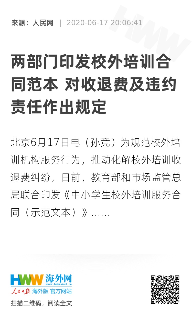 人民网北京6月17日电(孙竞)为规范校外培训机构服务行为,推动化解校外培训收退费纠纷,日前,教育部和市场监管总局联合印发《中小学生校外培训服务合同(示范文本)》。