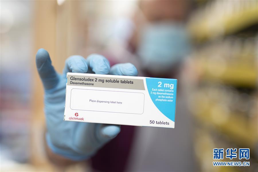 6月17日,在英国曼彻斯特一家药店,一名药剂师手持地塞米松。 新华社发(乔恩·休珀 摄)