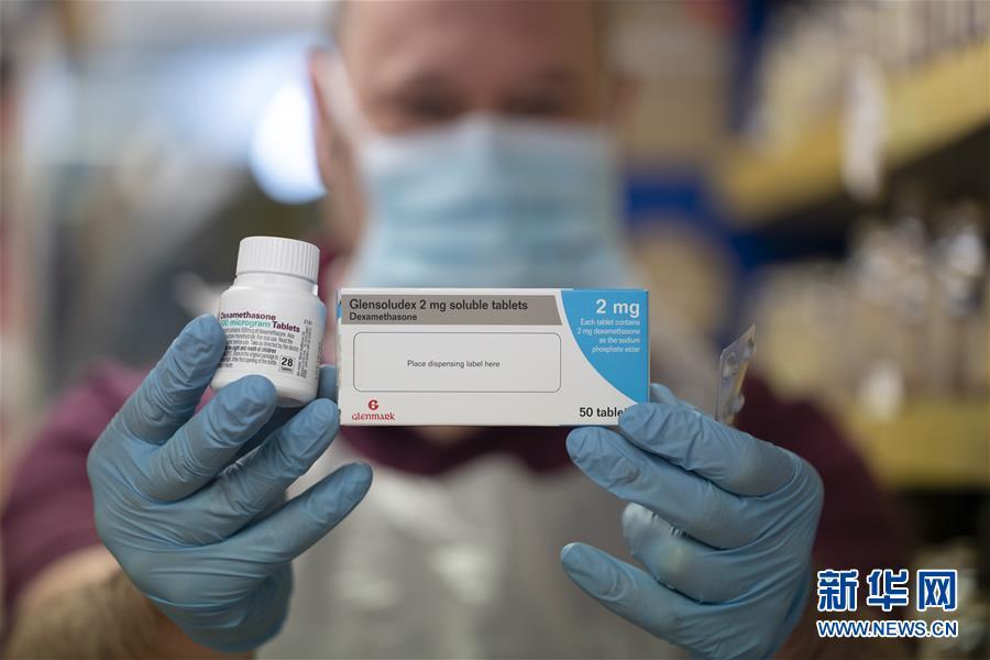 6月17日,在英国曼彻斯特一家药店,一名药剂师手持地塞米松。 新华社发(乔恩·休珀 摄)