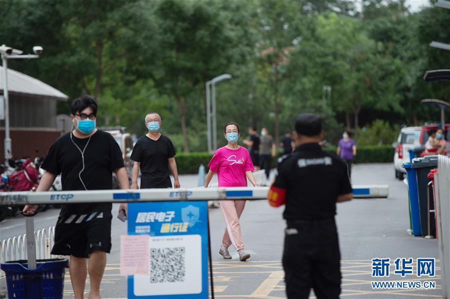 6月17日傍晚,居住在北京市西城区广外街道京铁和园社区的居民在社区内散步。新华社发(陈钟昊摄)