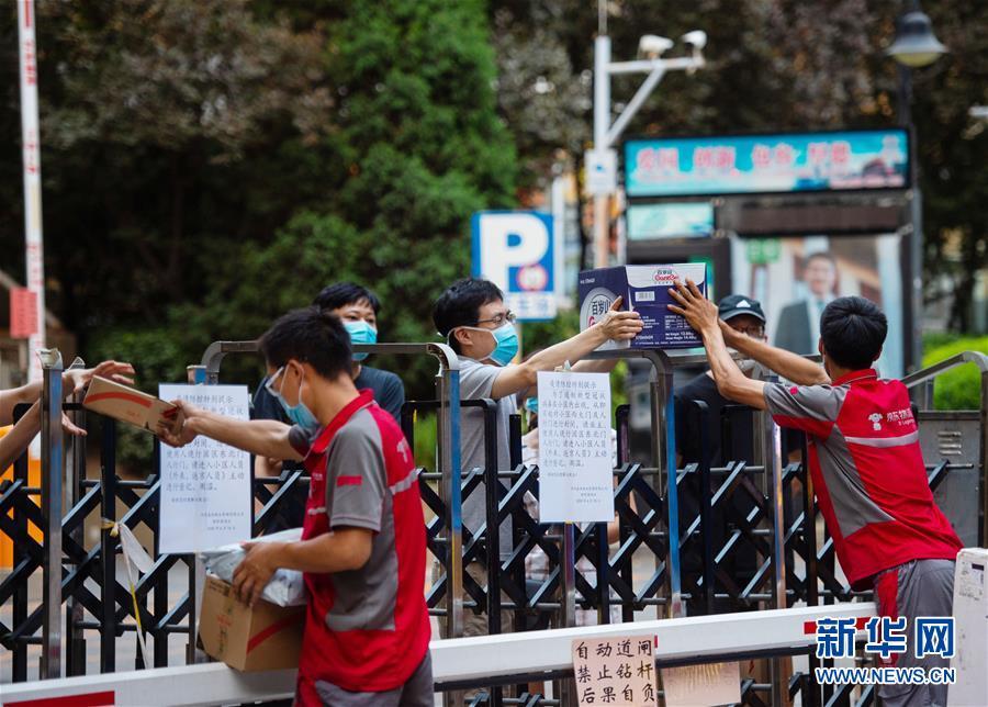 6月17日,快递员在围栏外为居住在北京市西城区广外街道手帕口南街社区的居民递送包裹。新华社发(陈钟昊摄)