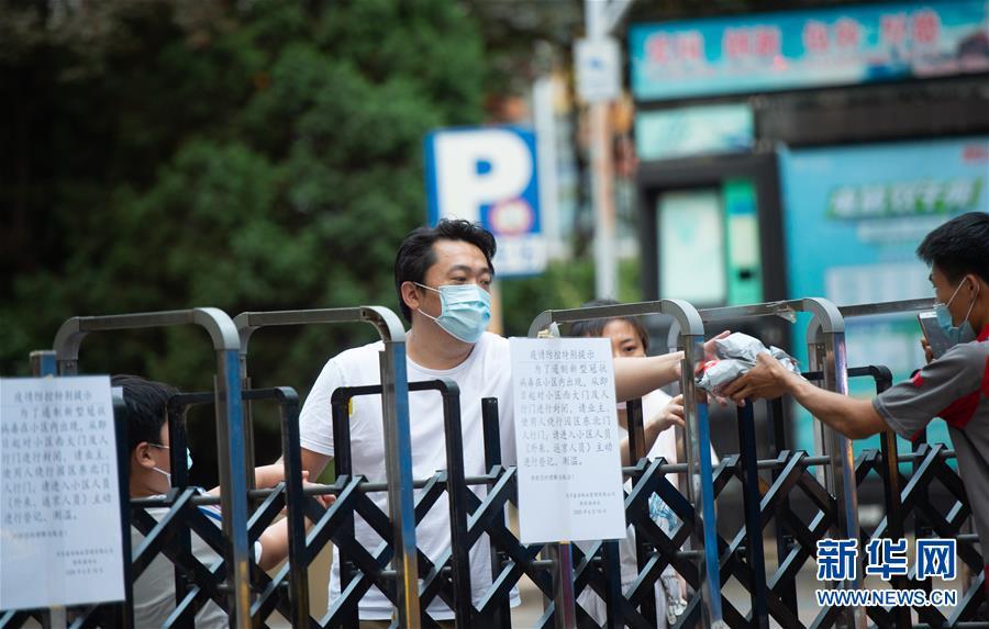 6月17日,居住在北京市西城区广外街道手帕口南街社区的居民隔着围栏收取快递。新华社发(陈钟昊摄)