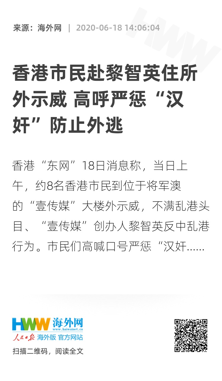 据报道,18日上午10点半左右,一批香港市民自发前往“壹传媒”大楼外,先有8人到场,参加者称随后还有人到达。他们在大楼外高叫口号,展示抗议标语横幅,写有“收洋钱 做汉奸”、“反中乱港”、“防黎智英外逃”等字样。市民们认为“汉奸黎”应受到国法港规严惩。