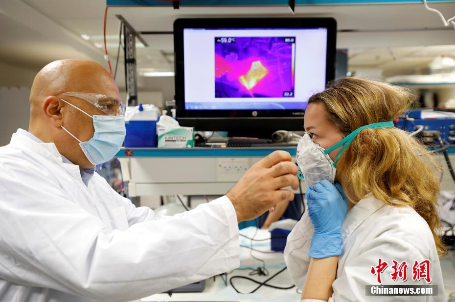 近日,以色列海法,研究小组人员在实验室演示他们发明的一种可重复使用,并自行消毒的口罩。