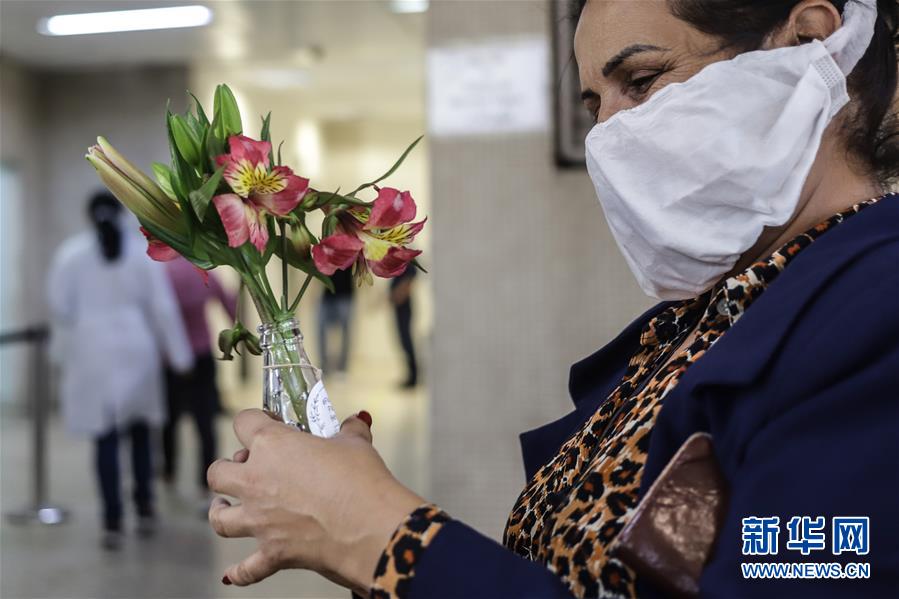 6月18日,巴西圣保罗市埃米利奥·里巴斯医院的一名医务工作者在下班时收到鲜花。  新华社发(拉赫尔·帕特拉索摄)
