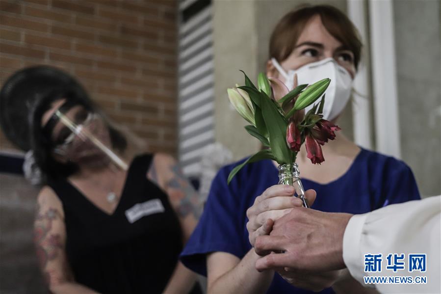 6月18日,巴西圣保罗市埃米利奥·里巴斯医院的一名医务工作者在下班时收到鲜花。新华社发(拉赫尔·帕特拉索摄)