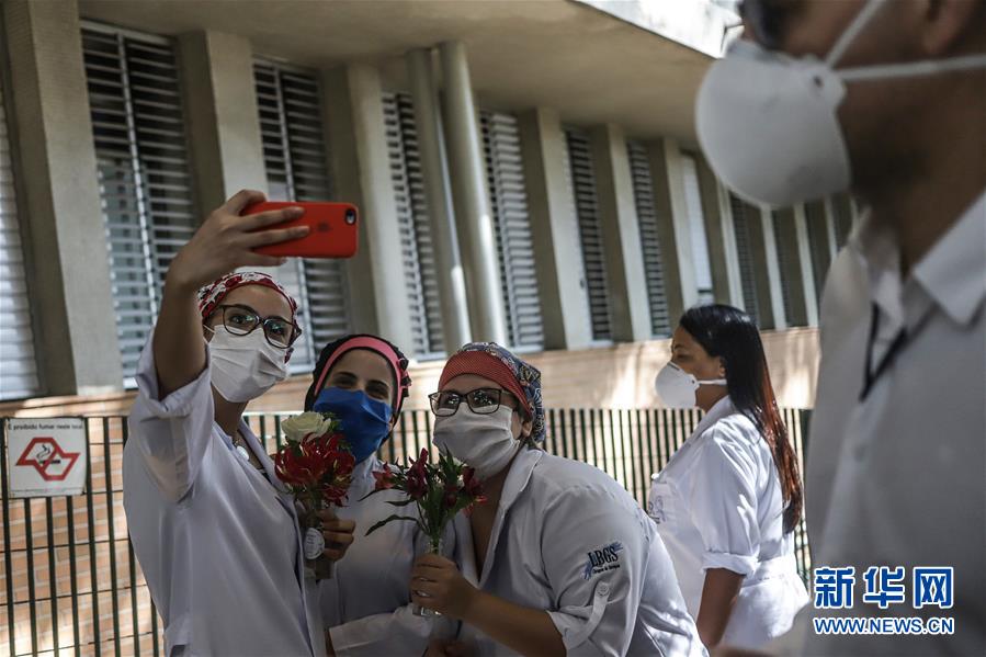 6月18日,巴西圣保罗市埃米利奥·里巴斯医院的医务工作者拿着鲜花一起自拍。 新华社发(拉赫尔·帕特拉索摄)