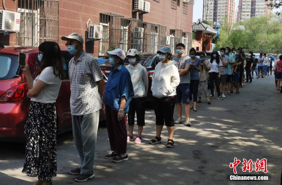 6月19日,北京西城一实施封闭管理的社区,工作人员为社区居民进行核酸检测。图为居民排队等待检测。 中新社记者 杜洋 摄