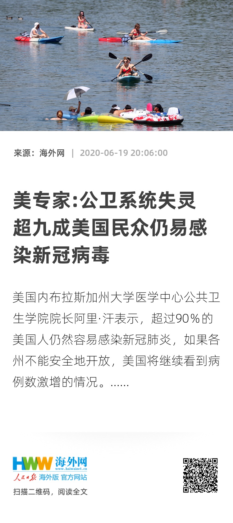 海外网6月19日电 美国内布拉斯加州大学医学中心公共卫生学院院长阿里·汗(Ali Khan)博士说,超过90%的美国人仍然容易感染新冠肺炎(Covid-19)。