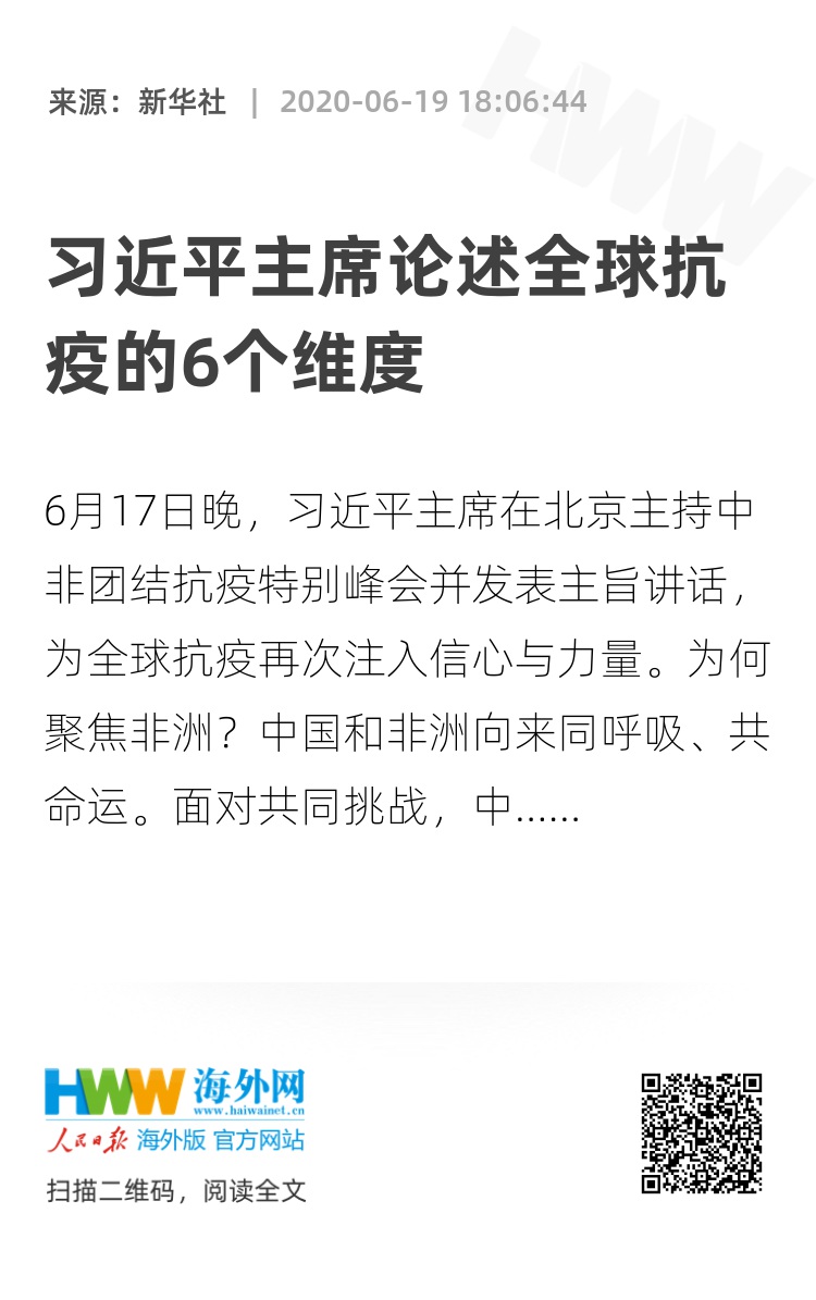 6月17日晚,习近平主席在北京主持中非团结抗疫特别峰会并发表主旨讲话,为全球抗疫再次注入信心与力量。