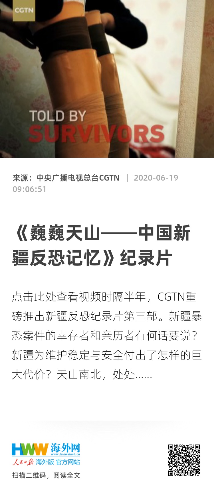 时隔半年,CGTN重磅推出新疆反恐纪录片第三部。新疆暴恐案件的幸存者和亲历者有何话要说?新疆为维护稳定与安全付出了怎样的巨大代价?天山南北,处处皆是壮美画卷;苍穹之下,每个人的故事都在继续……请看CGTN纪录片《巍巍天山——中国新疆反恐记忆》。警告:影片包含大量首次公布画面,部分镜头可能引起不适,请慎重观看。"It's a life-and-death struggle," "There's blood and tears"… This documentary chronicles personal accounts of survivors and witnesses, and reveals the physical and psychological toll of terrorism over the past decades in Xinjiang. It shines a light on how people in the region have been facing up to life in the aftermath. This video contains footage released for the first time. Viewer discretion is advised.