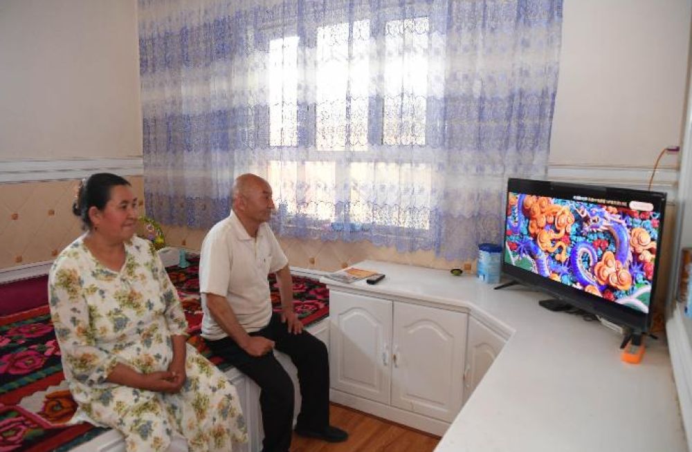 5月21日,在新疆于田县科克亚乡巴什艾格来村,买提热依木·如孜在家中看电视。新华社记者沙达提摄