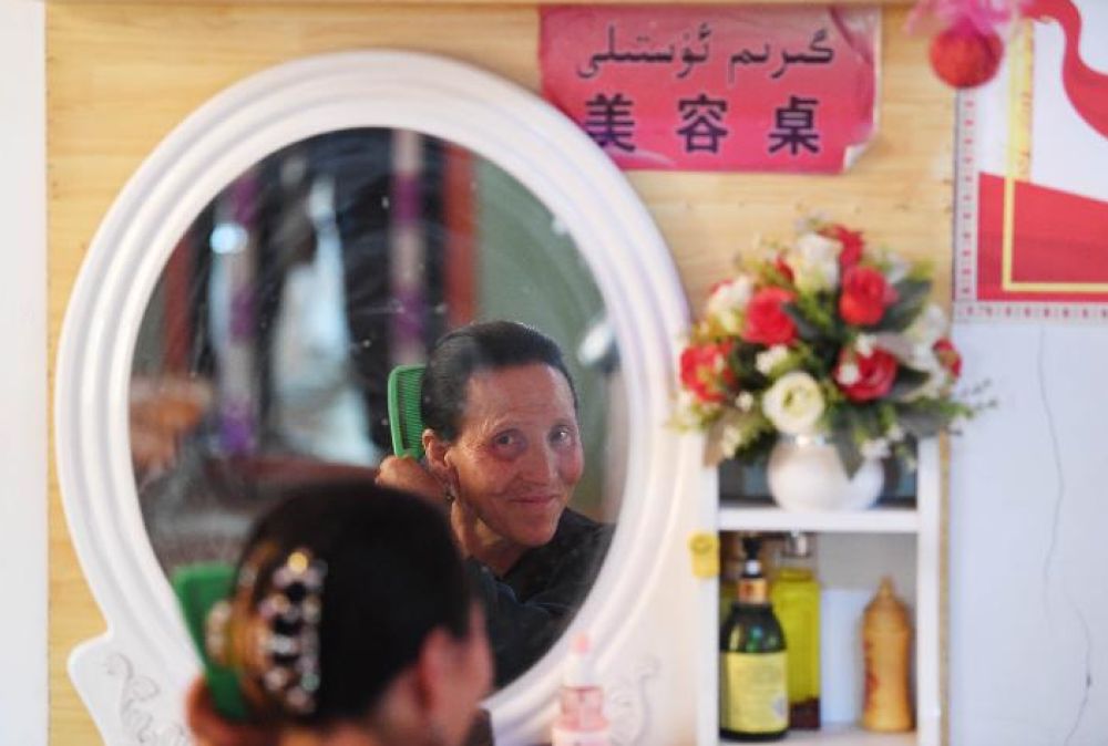 5月25日,在新疆和田地区策勒县恰哈乡恩尼里克村,村民凯麦尔罕·热杰普在家里梳妆。新华社记者沙达提摄