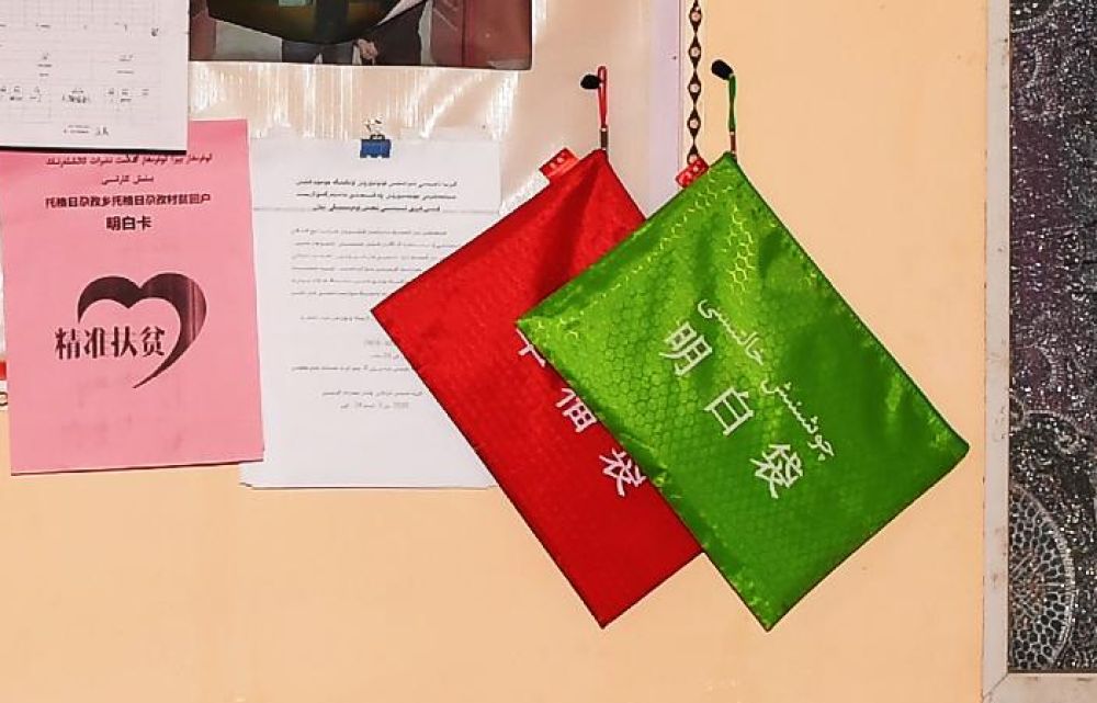 这是5月22日在新疆和田地区于田县托格日尕孜乡拍摄的村民家里的“明白袋”。“明白袋”记录了每家的基本情况,包括人口、土地、牛羊和收入等。新华社记者沙达提摄