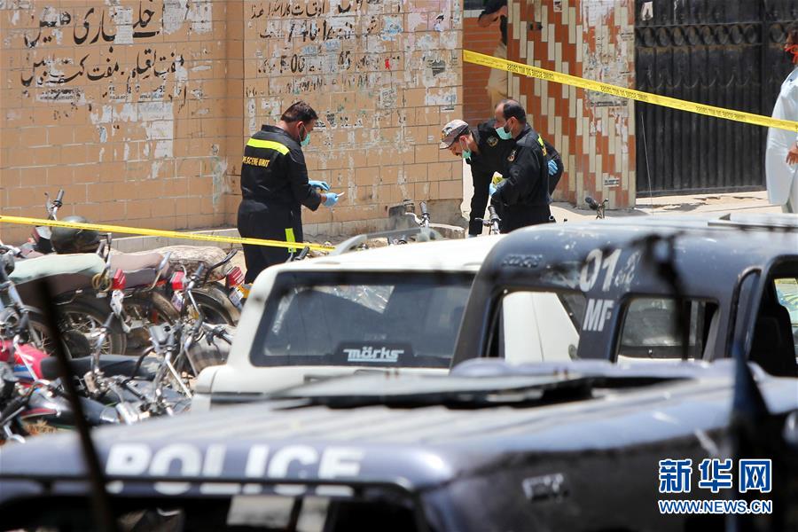 6月19日,在巴基斯坦南部信德省首府卡拉奇,安全人员在手榴弹袭击现场调查。 新华社发