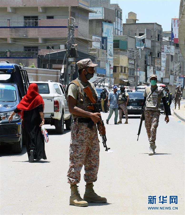 6月19日,在巴基斯坦南部信德省首府卡拉奇,安全人员在手榴弹袭击现场附近警戒。 新华社发