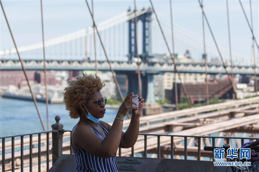 6月19日,一名女子在美国纽约布鲁克林大桥上拍照。 美国约翰斯·霍普金斯大学19日发布的新冠疫情最新统计数据显示,截至美国东部时间19日12时33分(北京时间20日0时33分),美国累计确诊病例2203659例,累计死亡病例118659例。 新华社记者 王迎 摄