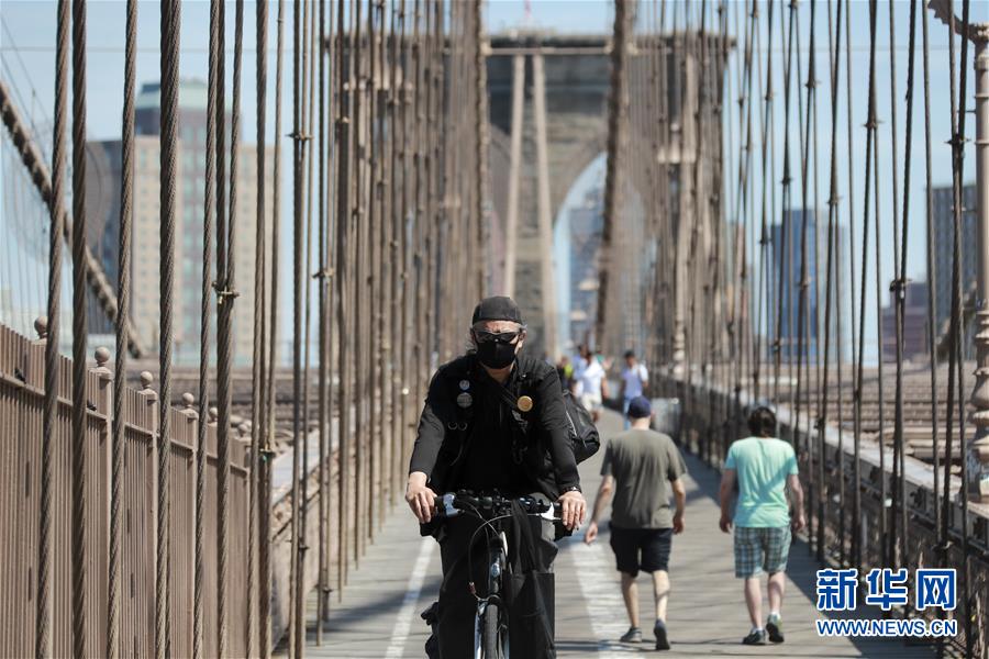 6月19日,戴口罩的骑行者通过美国纽约布鲁克林大桥。 美国约翰斯·霍普金斯大学19日发布的新冠疫情最新统计数据显示,截至美国东部时间19日12时33分(北京时间20日0时33分),美国累计确诊病例2203659例,累计死亡病例118659例。 新华社记者 王迎 摄
