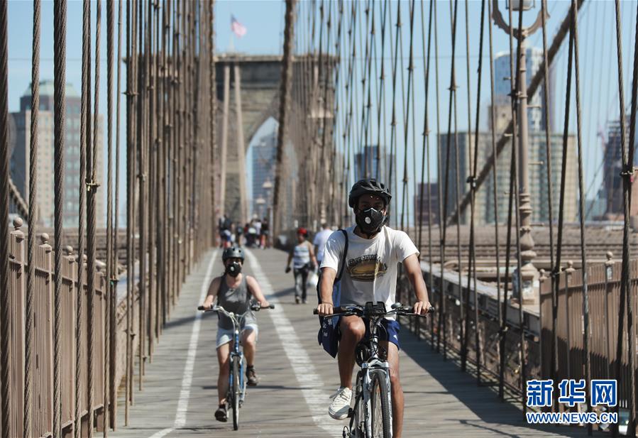 6月19日,戴口罩的骑行者通过美国纽约布鲁克林大桥。 美国约翰斯·霍普金斯大学19日发布的新冠疫情最新统计数据显示,截至美国东部时间19日12时33分(北京时间20日0时33分),美国累计确诊病例2203659例,累计死亡病例118659例。 新华社记者 王迎 摄