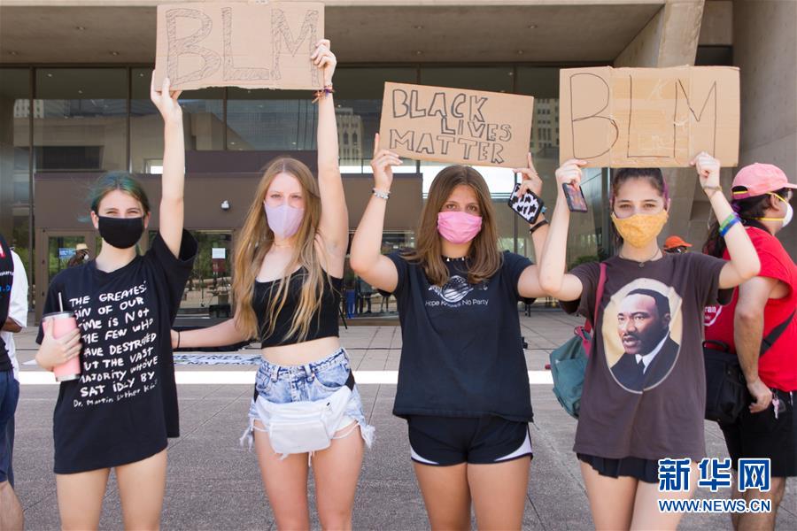 6月19日,几名女子手持标语参加美国达拉斯的“六月节”集会游行。新华社发(田丹摄)
