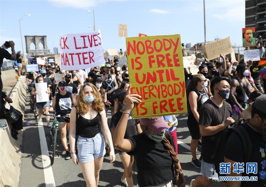 6月19日,游行队伍经过美国纽约布鲁克林大桥。 新华社记者 王迎 摄