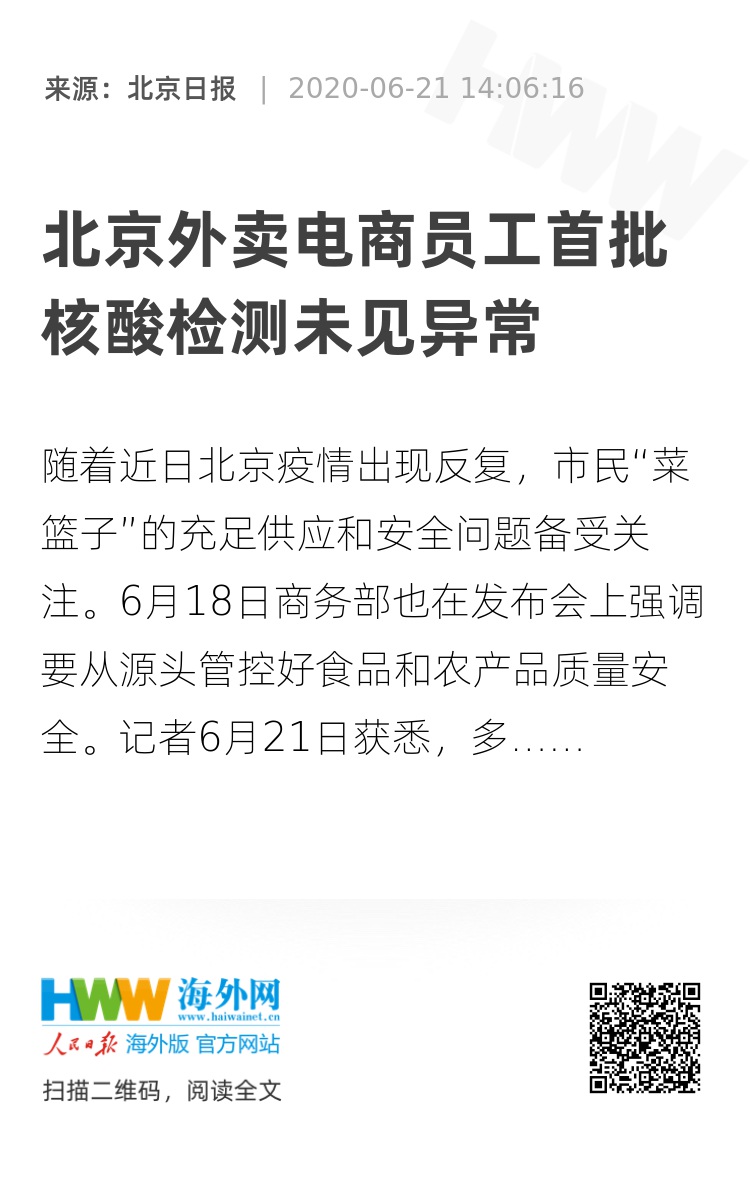 美团同日表示,已在政府部门指导下组织在京外卖骑手全部进行核酸检测,并升级无接触配送,继续采用无人配送车等模式,推动商家、骑手的检测结果线上可查询。除了骑手之外,美团旗下餐饮供应链平台快驴进货也已对北京区域所有仓储员工、供应商驻仓加工人员、配送服务司机进行核酸检测,且检测结果全部为阴性。近日,美团其他工作人员的核酸检测结果也将陆续出炉。