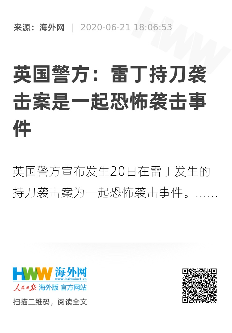海外网6月21日电 据英国广播公司报道,英国警方宣布发生20日在雷丁发生的持刀袭击案为一起恐怖袭击事件。当地时间20日晚,英国城市雷丁一处花园内发生持刀袭击事件。综合英国媒体消息,目前已有3人死亡,超过3人被送至医院接受救治。据悉,一名25岁的行凶男子已经被逮捕。目前,反恐警察已经接管了该案件。(海外网 王西洛)