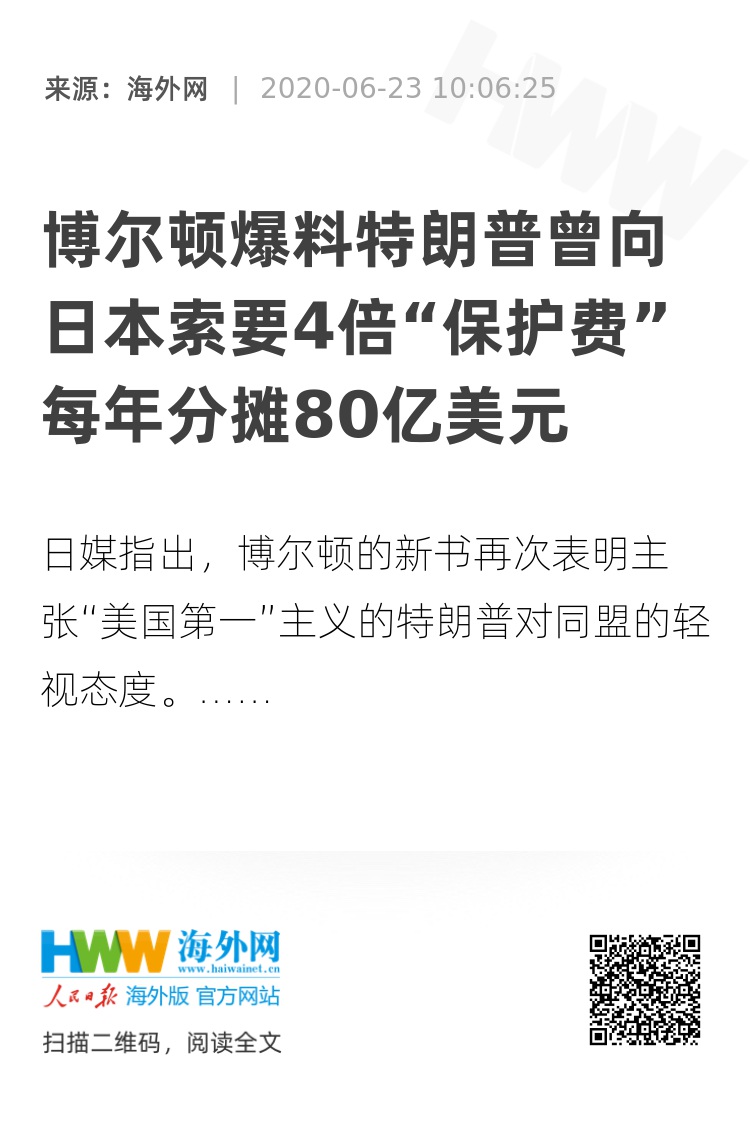 综合日本共同社等媒体报道,23日,博尔顿公开了有关特朗普政权内幕的回忆录。他表示,特朗普指示其威胁会撤走所有驻日美军,以使分摊费用谈判朝着美国占优势的方向推进。共同社评论称,在现行《日美安全保障条约》于23日迎来生效60周年的形势下,该书再次暴露出主张“美国第一”主义的特朗普对同盟的轻视态度。