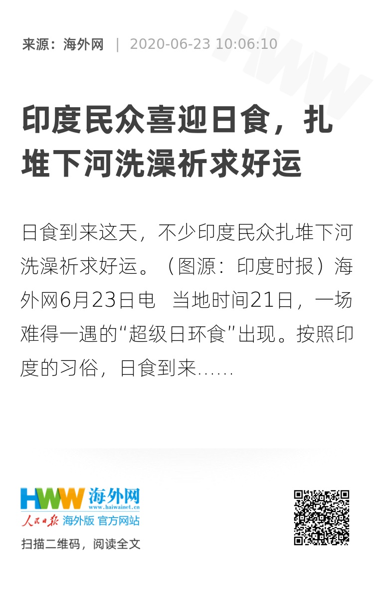 海外网6月23日电 当地时间21日,一场难得一遇的“超级日环食”出现。按照印度的习俗,日食到来这天在河水中沐浴,能够为自己和家人祈福。尽管印度国内目前疫情形势严峻,还是有不少印度民众扎堆下河洗澡祈求好运。