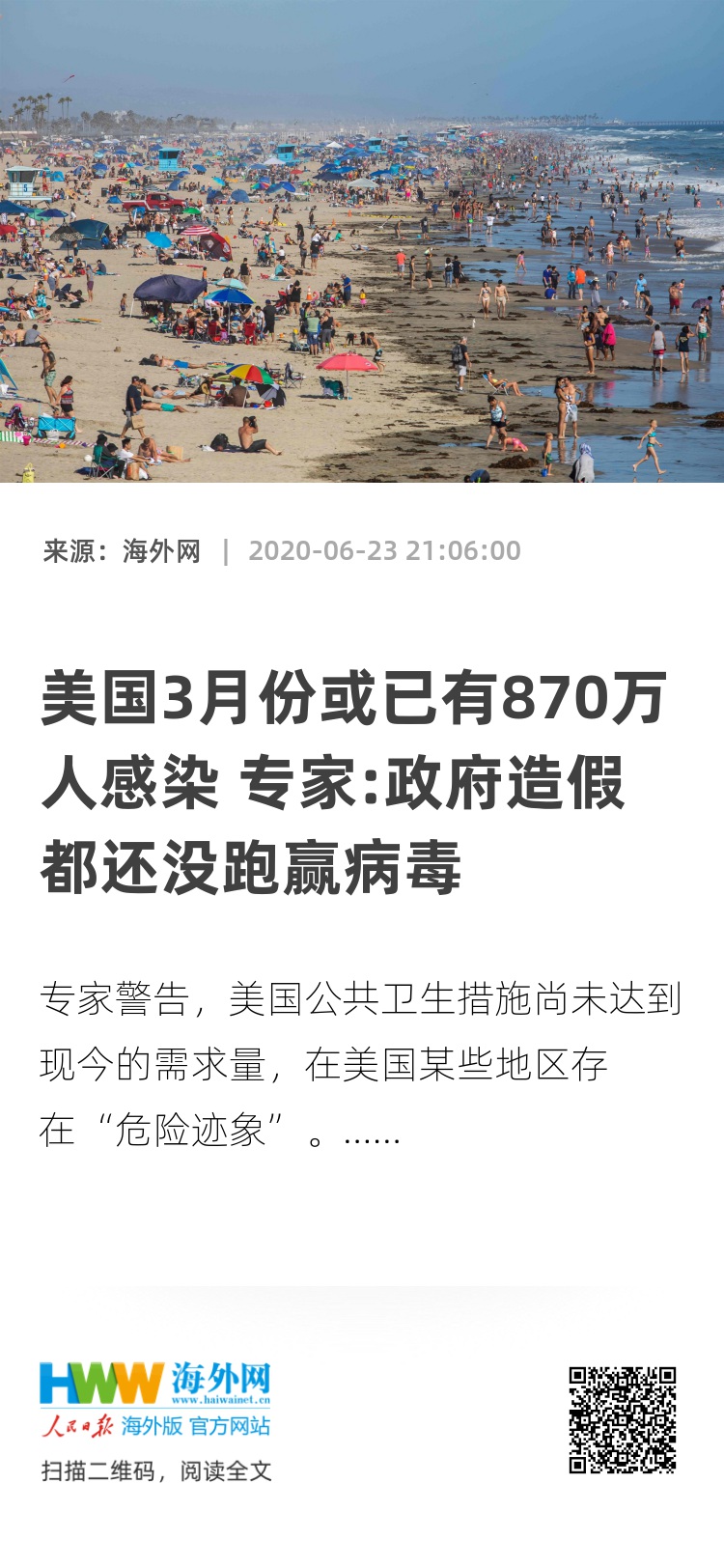 海外网6月23日电 美国重启经济社会生活后,全国一半的州份报告新病例激增,且最新研究指出今年3月份就有800多万美国人感染新冠病毒。专家警告,美国公共卫生措施尚未达到现今的需求量,在美国某些地区存在“危险迹象”。