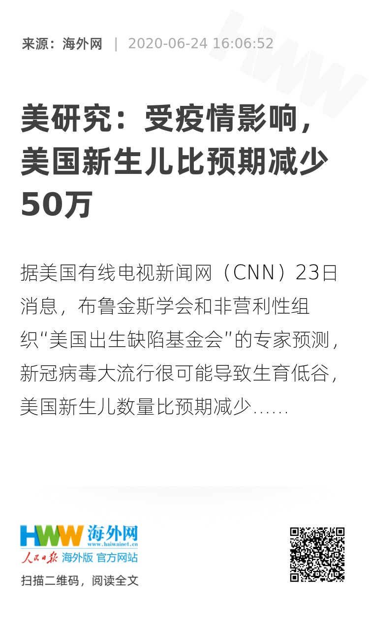 海外网6月24日电 据美国有线电视新闻网(CNN)23日消息,布鲁金斯学会和非营利性组织“美国出生缺陷基金会”的专家预测,新冠病毒大流行很可能导致生育低谷,美国新生儿数量比预期减少50万。