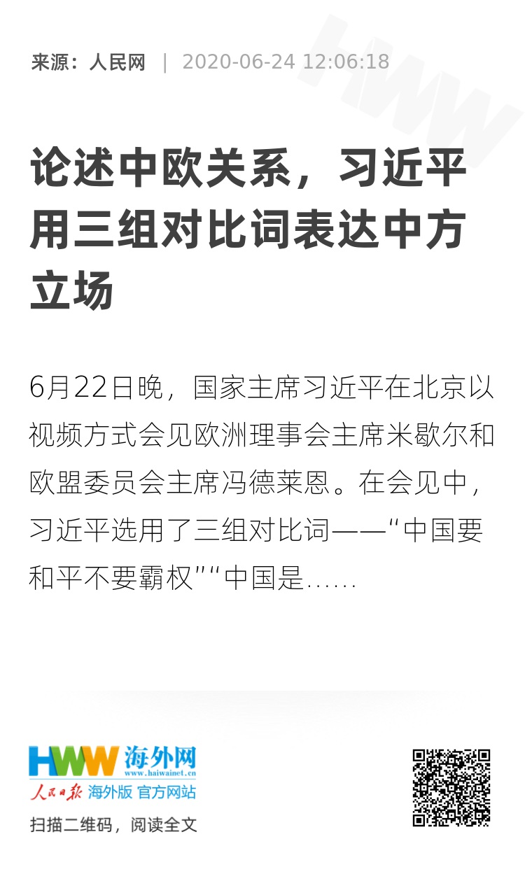6月22日晚,国家主席习近平在北京以视频方式会见欧洲理事会主席米歇尔和欧盟委员会主席冯德莱恩。在会见中,习近平选用了三组对比词——“中国要和平不要霸权”“中国是机遇不是威胁”“中国是伙伴不是对手”。这三组对比词含义丰富,表达了中方推动中欧关系迈向更高水平的态度与信心。