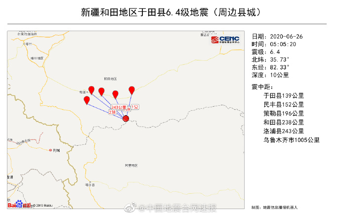 05时05分在新疆和田地区于田县(北纬35.73度,东经82.33度)发生6.4级地震,震源深度10千米。