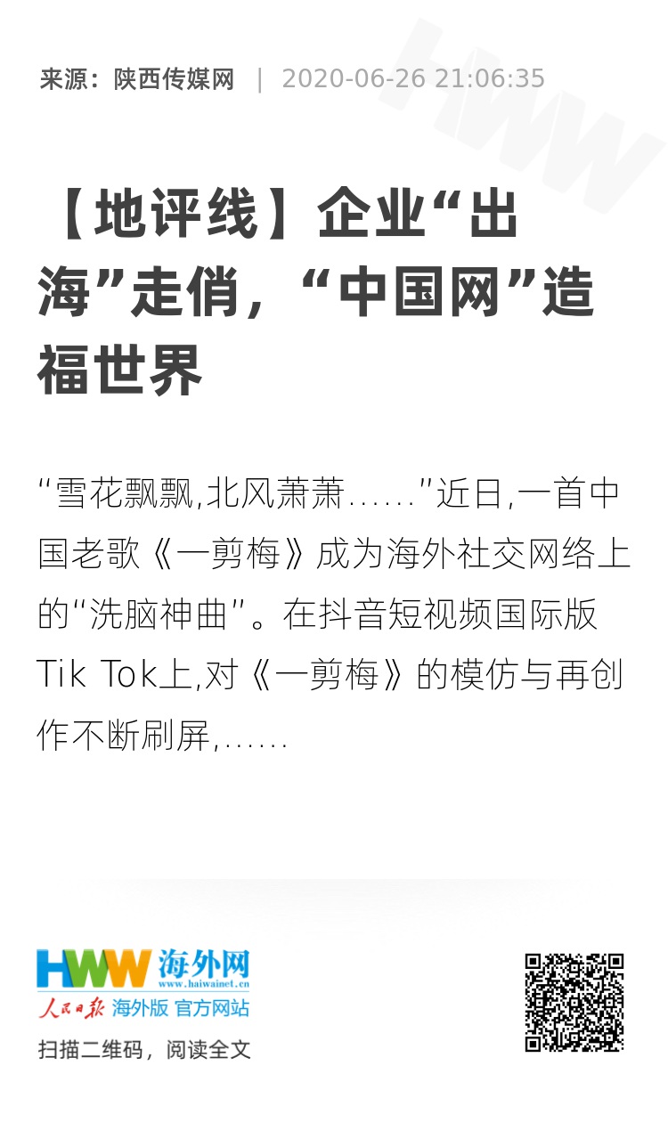 “雪花飘飘,北风萧萧……”近日,一首中国老歌《一剪梅》成为海外社交网络上的“洗脑神曲”。在抖音短视频国际版Tik Tok上,对《一剪梅》的模仿与再创作不断刷屏,引发了一场“全民狂欢”的行为艺术。Tik Tok在海外的持续走红,是中国互联网企业出海加速的写照。信息技术高速发展的今天,中国互联网企业的技术应用不断出海,在众多国家得到迅速普及。数字版的Made in China,成为中国制造的新标签。