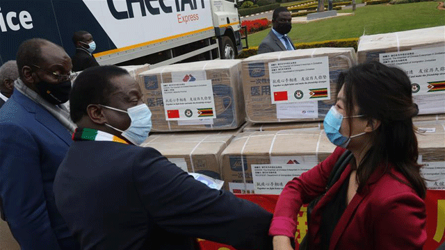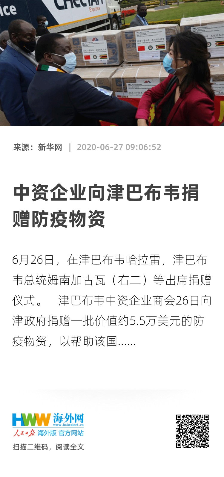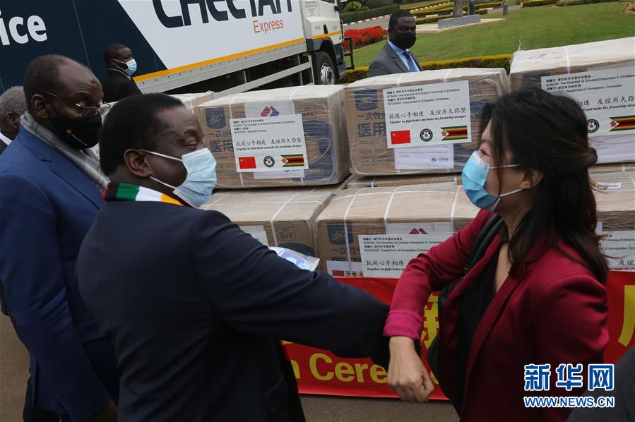 6月26日,在津巴布韦哈拉雷,津巴布韦总统姆南加古瓦(右二)等出席捐赠仪式。 津巴布韦中资企业商会26日向津政府捐赠一批价值约5.5万美元的防疫物资,以帮助该国应对新冠疫情。 新华社记者 张玉亮 摄