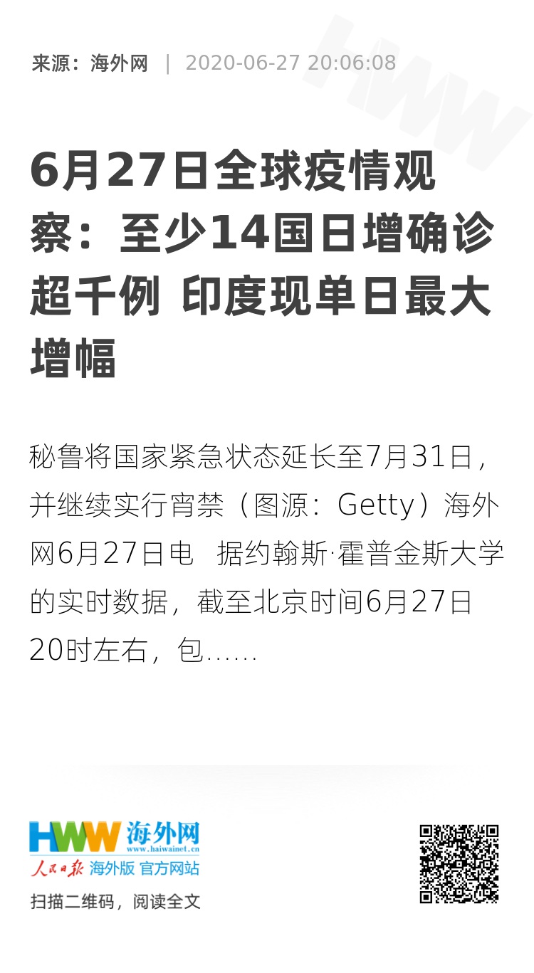 海外网6月27日电 据约翰斯·霍普金斯大学的实时数据,截至北京时间6月27日20时左右,包括美国、巴西、俄罗斯等国在内的至少14个国家单日新增确诊病例数均超过千例。其中巴西新增46860例,美国新增41631例,印度新增18552例,俄罗斯新增6852例。截至目前,全球新冠肺炎确诊病例累计已超982.5万例,累计死亡病例超49.4万例。