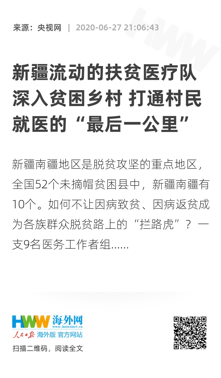 武警新疆总队医院肝胆外科主任医师 庄仕华:新疆南疆地区是脱贫攻坚的重要地区,医疗队深入南疆贫困乡村进行医疗巡诊,主要是宣传卫生防病知识,同时对一些慢性病有手术指征的病人,接到医院免费进行手术治疗,同时对慢性病进行长期的药物指导治疗,目的就是要除掉病根拔掉穷根,让老百姓尽快地过上好日子,这是我们医疗小分队每位成员的初心,这项工作我们还将长期继续坚持下去。