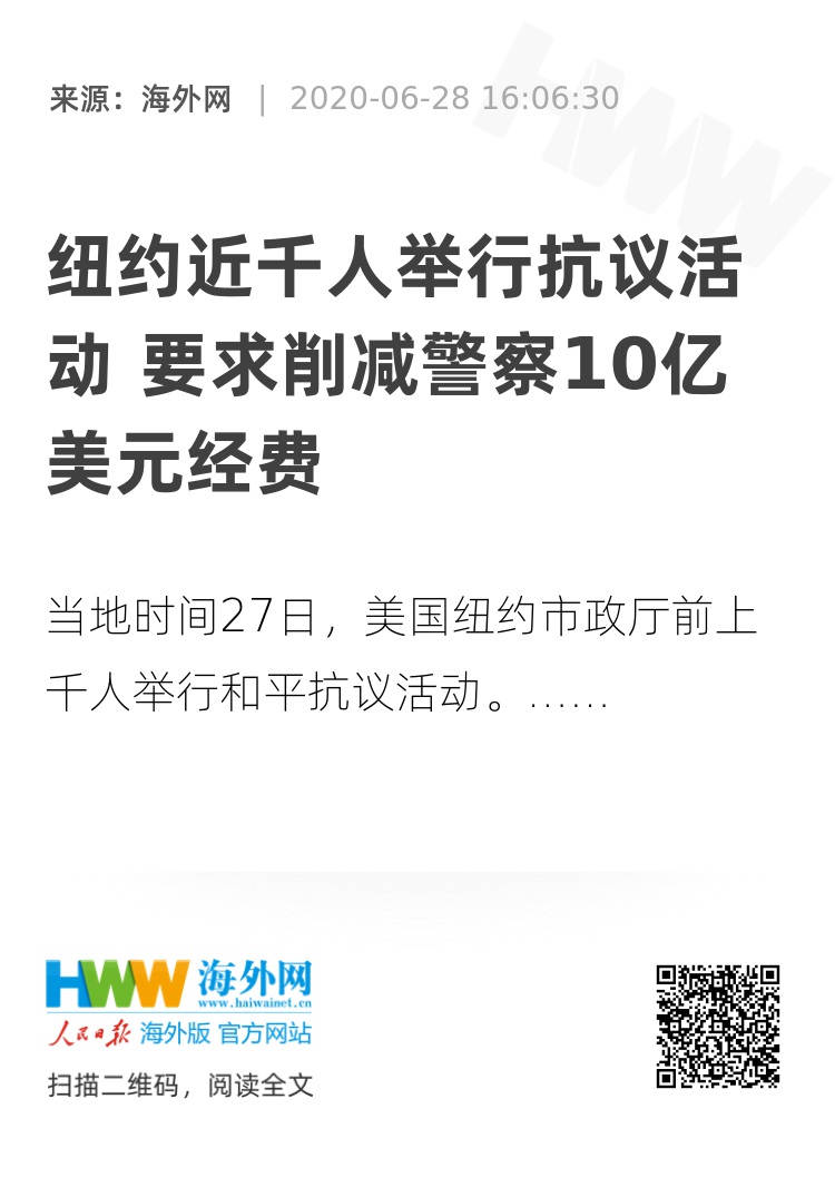报道称,这次抗议是和平的,与最初的全国性抗议相比,气氛有很大的不同。最初的抗议活动那个是由弗洛伊德之死引发的。参加此次抗议的人员主要是学生和专业人士,比如不断画弗洛伊德肖像和海报的艺术家们。当天没有警察在场,但抗议者称人群中有不穿制服的警察。2019年纽约警察的年度预算平均为60亿美元,约占了该市总支出的6%。下一个财政年度将于7月1日开始。(海外网 李芳)