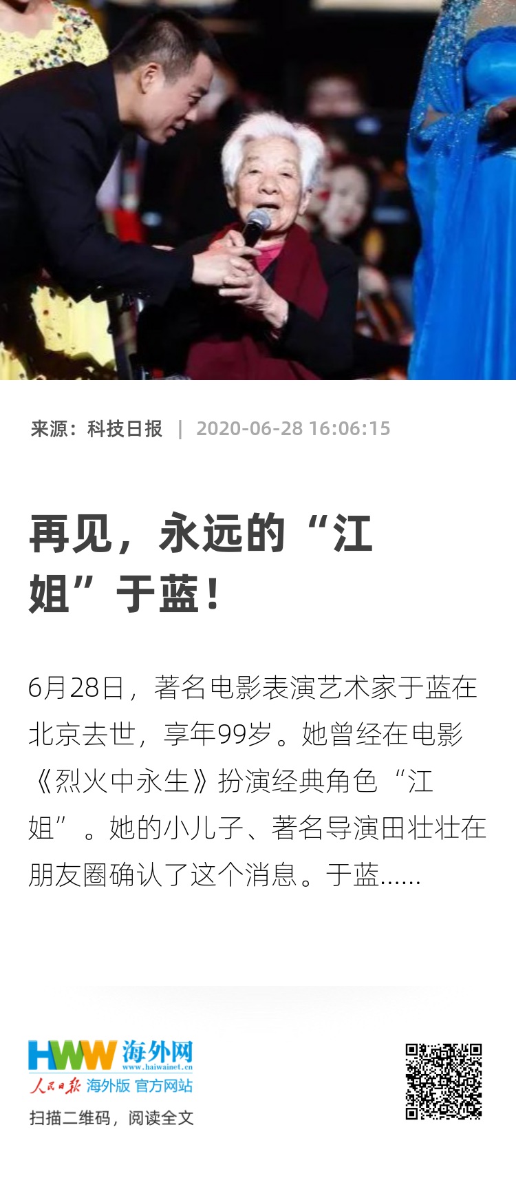 6月28日,著名电影表演艺术家于蓝在北京去世,享年99岁。她曾经在电影《烈火中永生》扮演经典角色“江姐”。