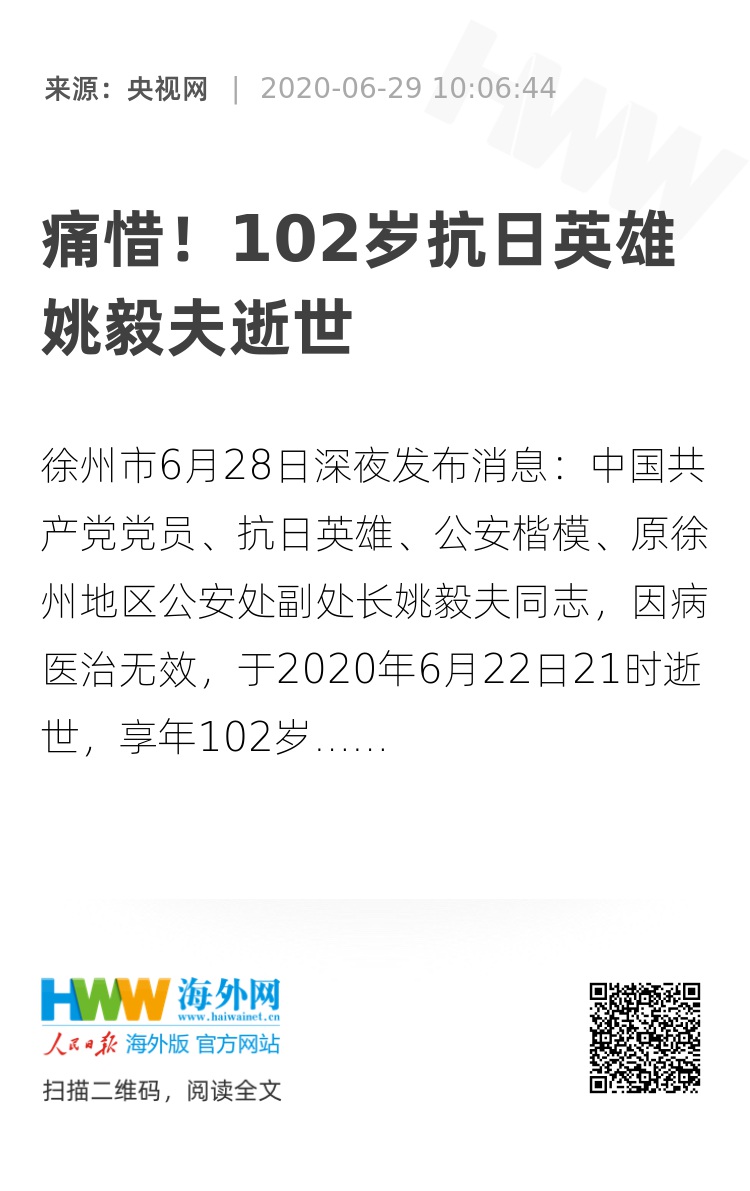 徐州市6月28日深夜发布消息:中国共产党党员、抗日英雄、公安楷模、原徐州地区公安处副处长姚毅夫同志,因病医治无效,于2020年6月22日21时逝世,享年102岁。