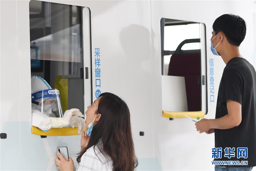 6月28日,在北京市西城区北京展览馆南侧的露天广场核酸检测采样点,核酸检测采样车内的医护人员为前来做检测的人员进行采样。  新华社记者 鞠焕宗 摄