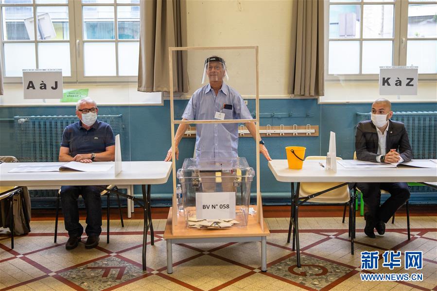 6月28日,在法国巴黎一家投票站,工作人员戴面罩和口罩工作。 当日,法国举行市镇选举第二轮投票。受新冠肺炎疫情影响,本轮投票由原定的3月22日推迟至6月28日举行。 新华社发(奥雷利安·莫里萨尔摄)